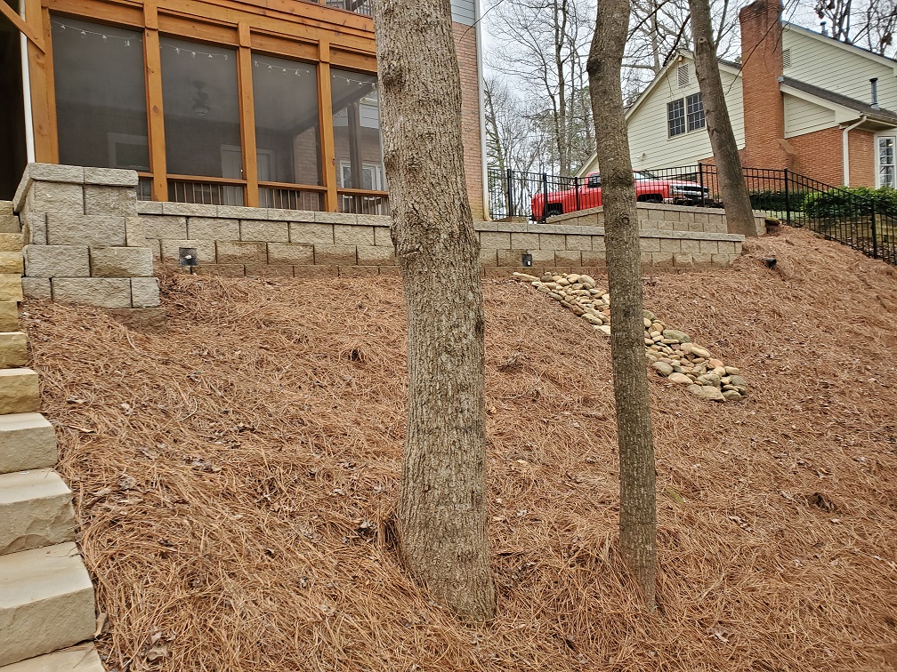 I'm having trouble locating the before pics, but here are a few after pics:We're a couple of weeks or so away from a contractor we hired breaking ground (literally) on a massive hardscaping project - two new retaining walls to terrace the east side of the backyard that's currently an eroding steep slope, a new retaining wall on the west side of the backyard to extend the usable area of that (slightly less) steeply sloped yard, replacing several existing wood retaining walls with masonry walls, replacing the wood steps with stone, replacing the backyard fence, and I'm probably missing a couple of things.